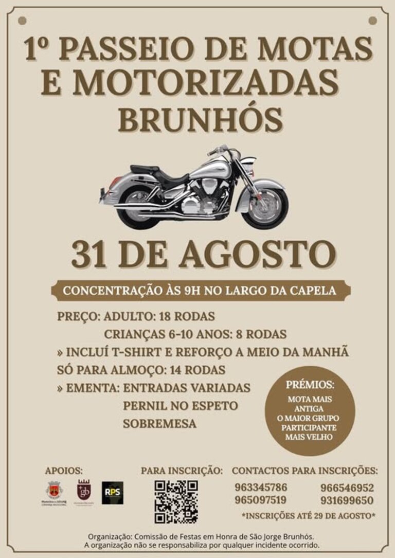 A Comissão de Festas em Honra de São Jorge 2026, organiza o 1º Passeio de Motas e Motorizadas de Brunhós.