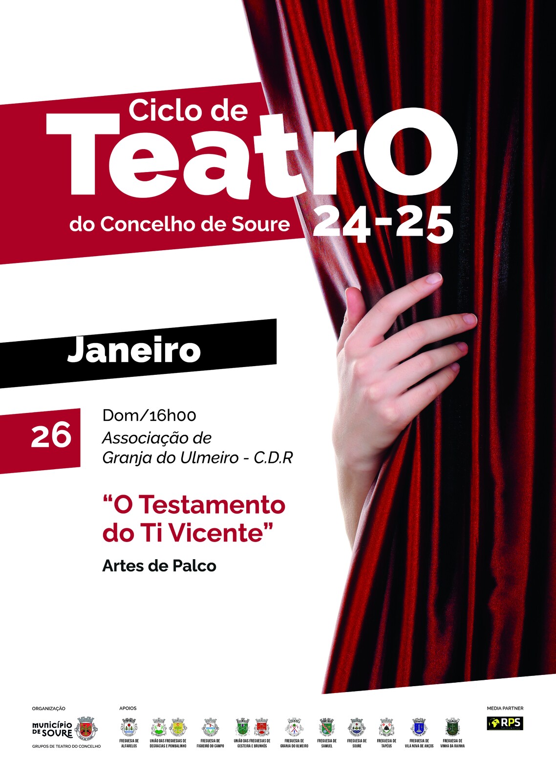 No dia 26 de janeiro, domingo, pelas 16h00 na Associação de Granja do Ulmeiro - C.D.R., o Grupo Artes de Palco, apresenta o espetáculo "O Testamento do Ti Vicente".