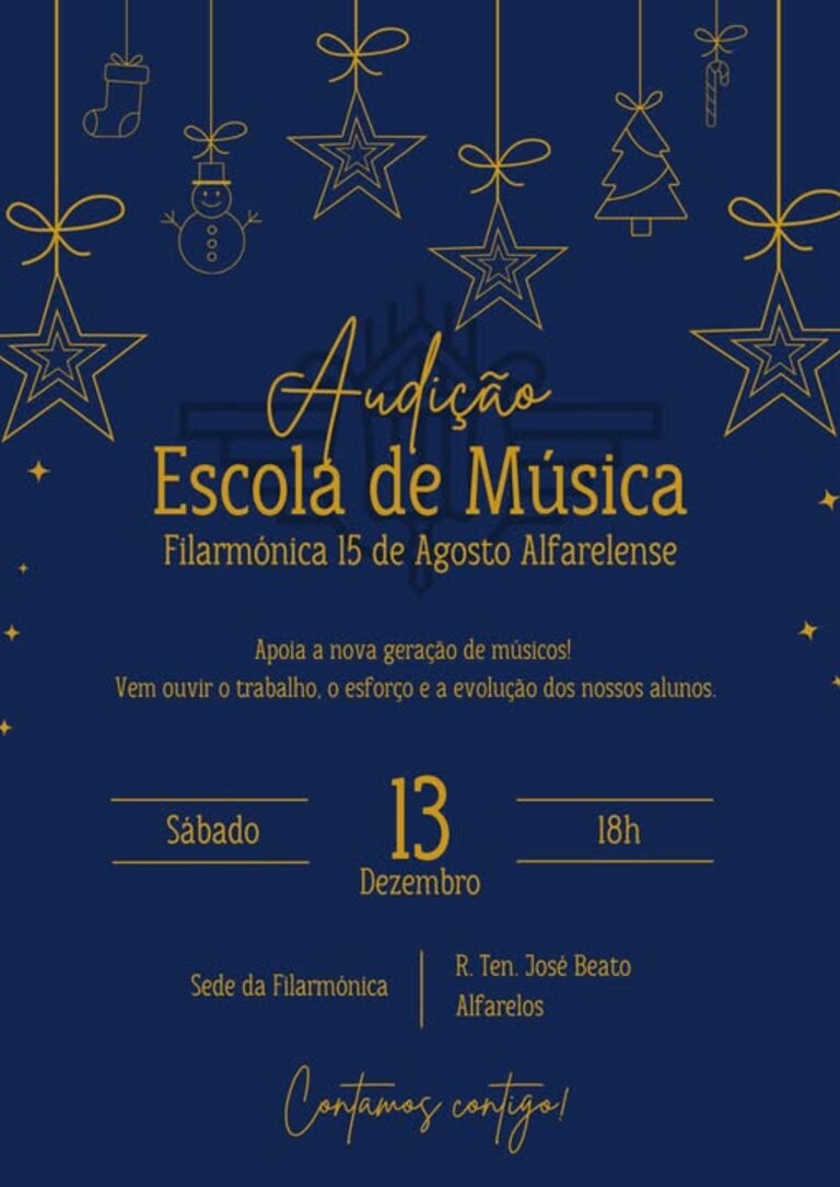 A Filarmónica 15 de Agosto Alfarelense promove, no próximo dia 13 de dezembro, a audição de Natal da sua Escola de Música, um momento dedicado à apresentação do trabalho desenvolvido pelos alunos ao longo do ano.