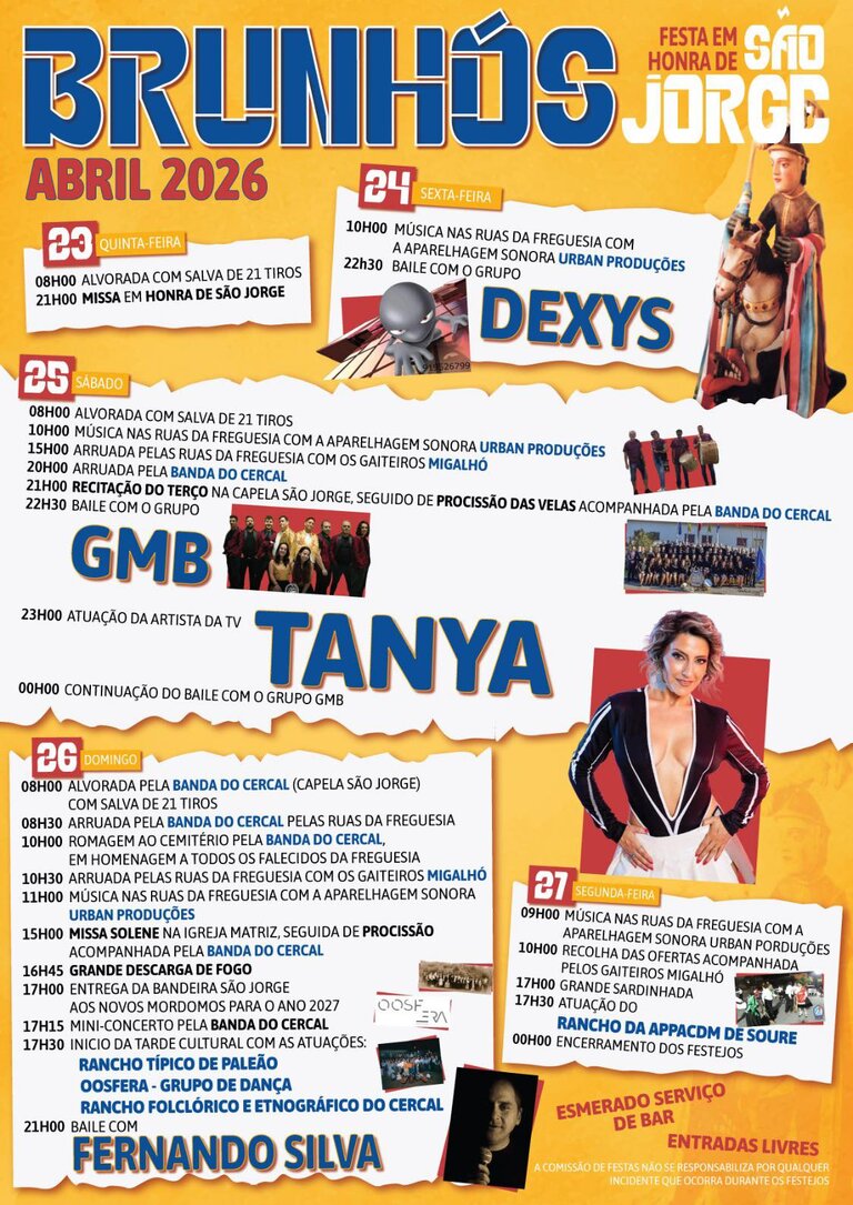 A localidade de Brunhós prepara-se para celebrar as tradicionais Festas em Honra de São Jorge, que decorrem entre os dias 23 e 27 de abril de 2026, com um programa diversificado que conjuga momentos religiosos, culturais e de animação musical.