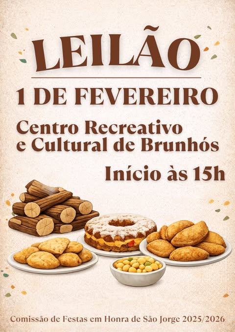 No âmbito das Festas em Honra de São Jorge 2025/2026, realiza-se no próximo dia 1 de fevereiro o tradicional Leilão, no Centro Recreativo e Cultural de Brunhós.