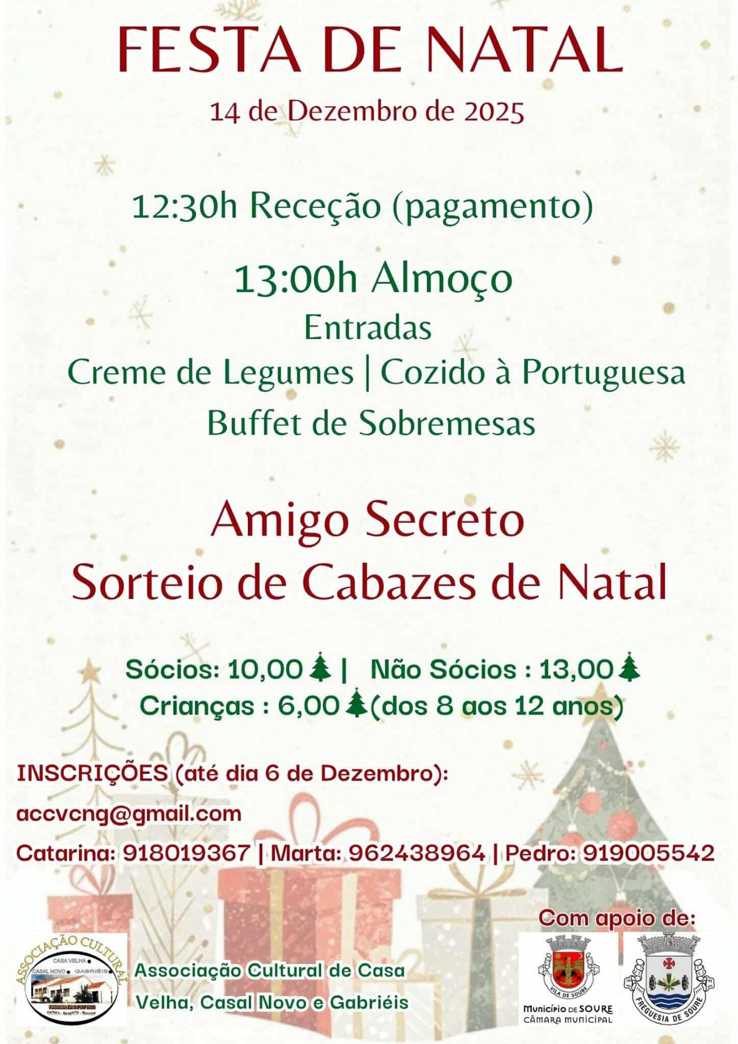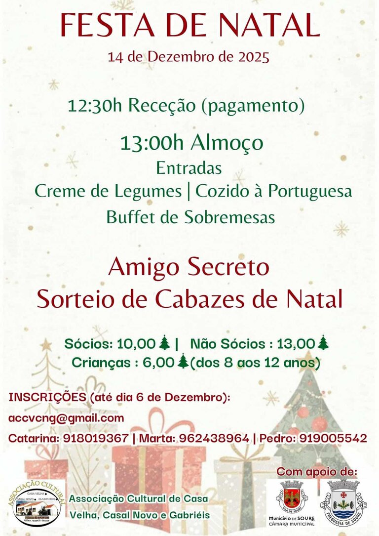 A Associação Cultural de Casa Velha, Casal Novo e Gabiréis realiza a sua Festa de Natal no dia 14 de dezembro de 2025.
