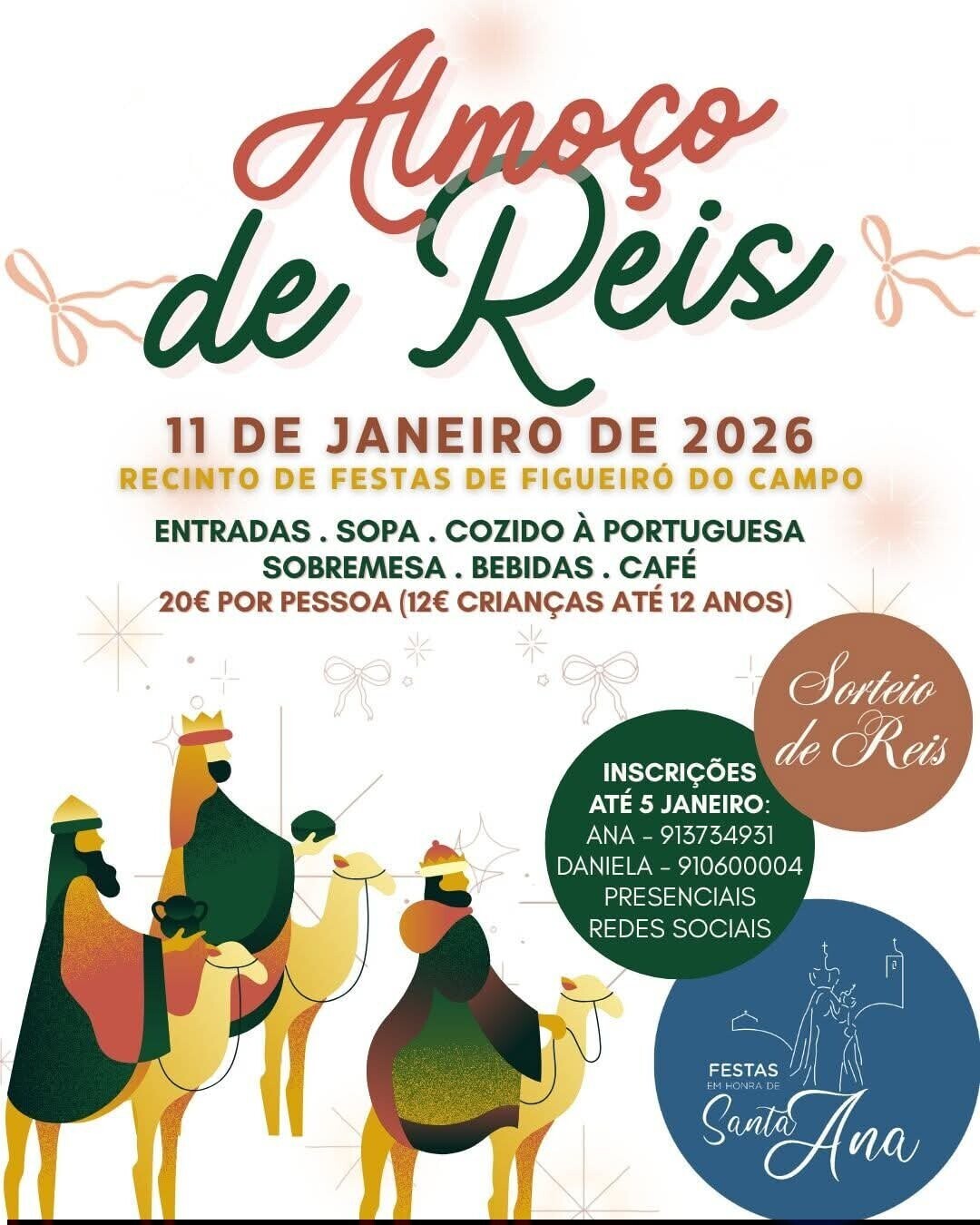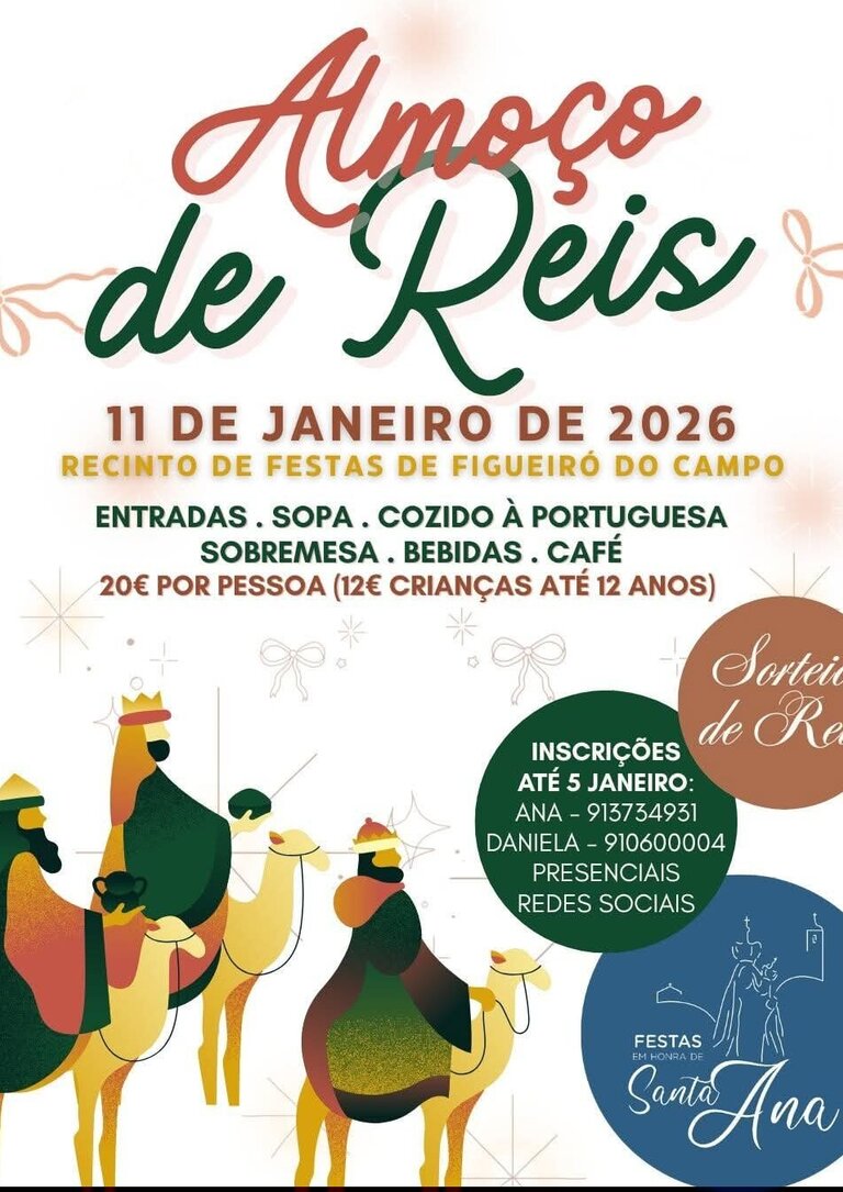 A Comissão de Festas em Honra de Santa Ana promove, no próximo dia 11 de janeiro de 2026, o tradicional Almoço de Reis, a realizar no Recinto de Festas de Figueiró do Campo.