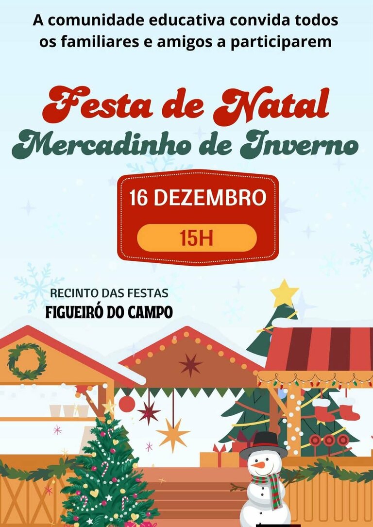 A comunidade educativa convida familiares e amigos a participarem na Festa de Natal e Mercadinho de Inverno, a realizar-se no próximo dia 16 de dezembro, pelas 15h00, no Recinto das Festas de Figueiró do Campo.
