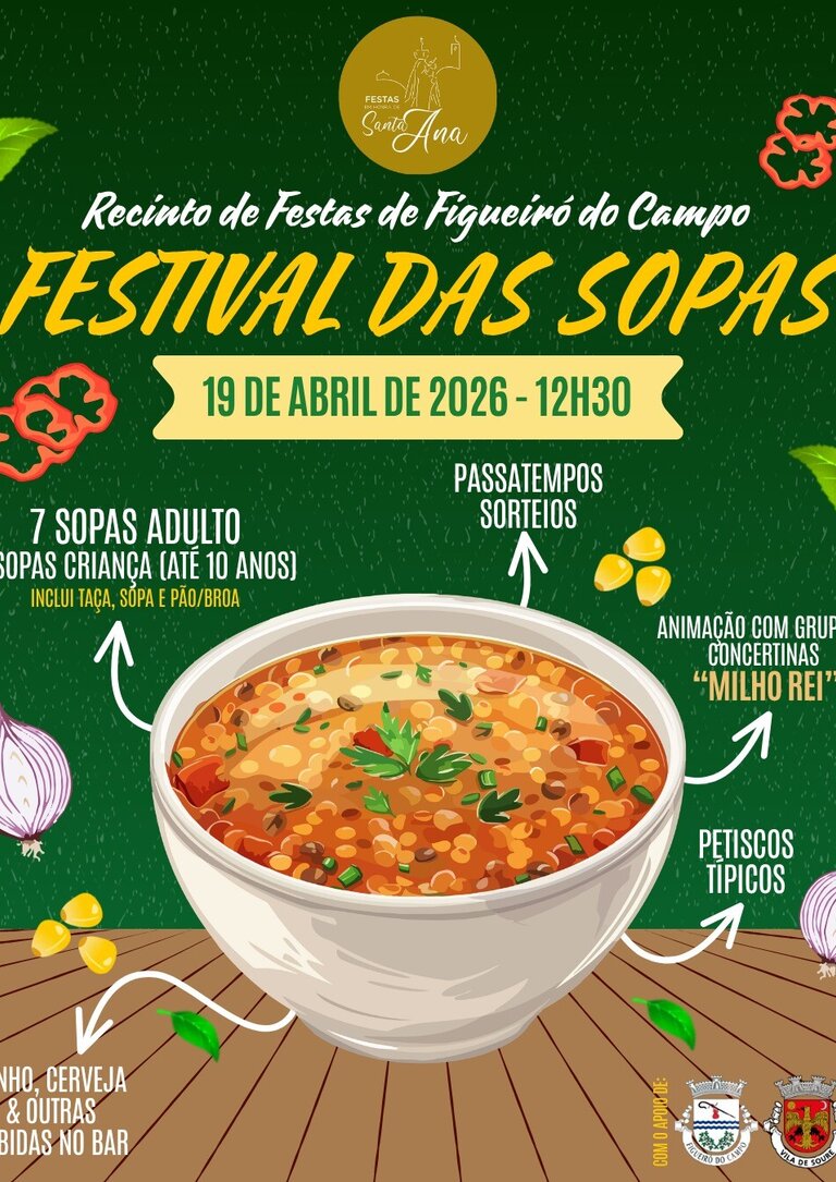 O Recinto de Festas de Figueiró do Campo recebe, no próximo dia 19 de abril de 2026, pelas 12h30, mais uma edição do Festival das Sopas, integrado nas Festas em honra de Santa Ana.