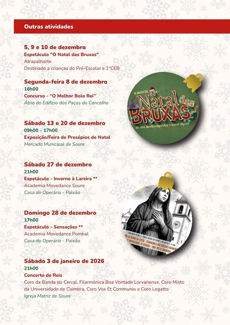 - No sábado, dia 27 de dezembro, às 21h00, sobe ao palco o espetáculo “Inverno à Lareira”, pela Academia Movedance Soure.