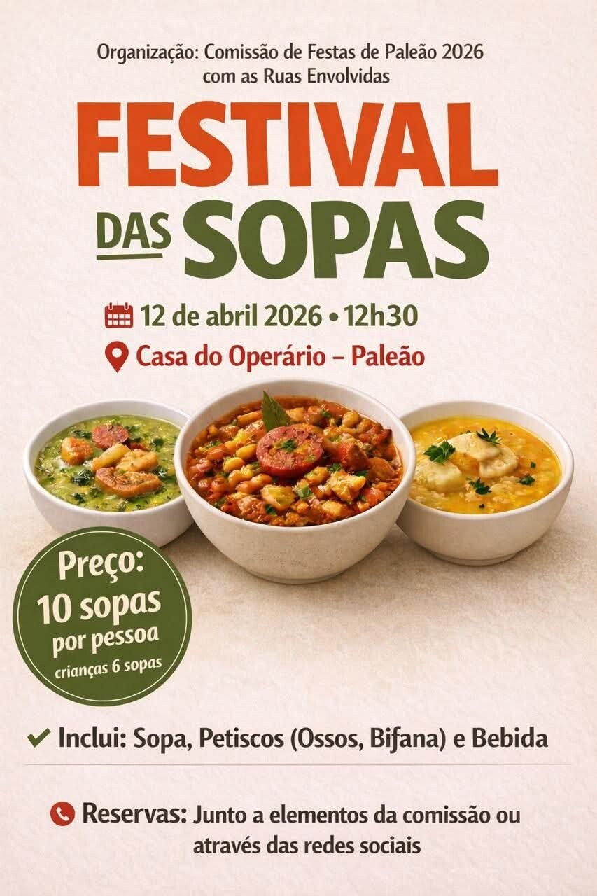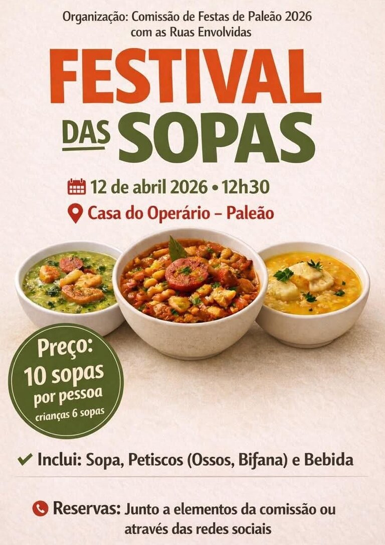 A localidade de Paleão recebe, no próximo dia 12 de abril de 2026, pelas 12h30, o Festival das Sopas, que terá lugar na Casa do Operário.