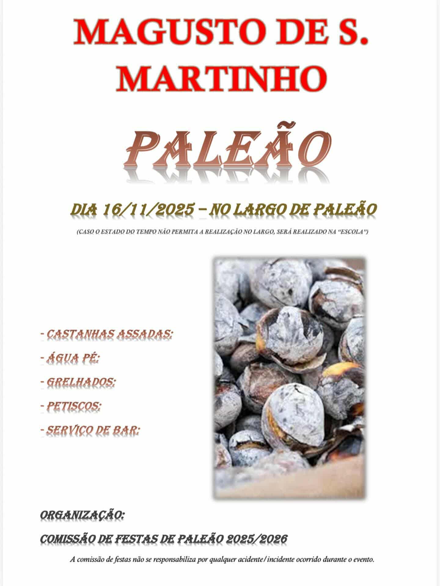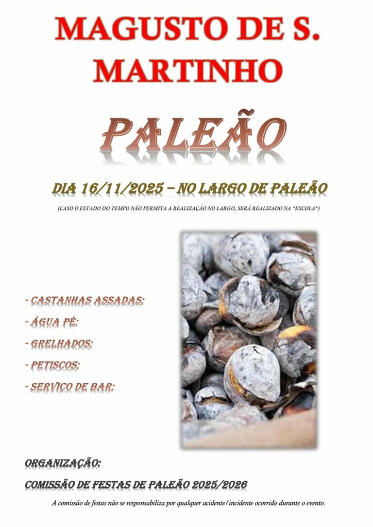 A Comissão de Festas de Paleão 2025/2026 organiza o tradicional Magusto de São Martinho, no próximo dia 16 de novembro de 2025, no Largo de Paleão.