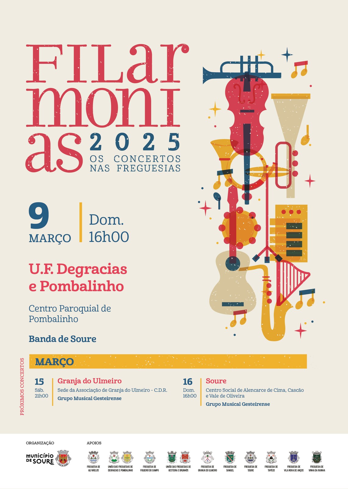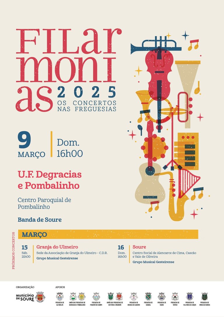 Na tentativa de fazer chegar a música a todo o território do concelho, o Município de Soure promove o Programa "Filarmonias 2025, Os Concertos nas Freguesias" em parceria com as Juntas de Freguesia. O objetivo é descentralizar as atividades culturais, fazendo chegar este programa a todas as freguesias e promover a diversidade musical.