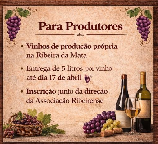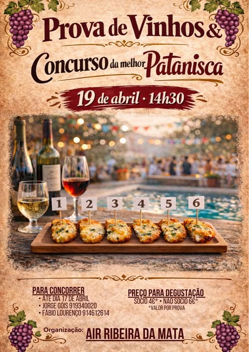 A localidade da Ribeira da Mata recebe, no próximo dia 19 de abril, pelas 14h30, uma Prova de Vinhos associada ao Concurso da Melhor Patanisca, numa iniciativa organizada pela AIR Ribeira da Mata.