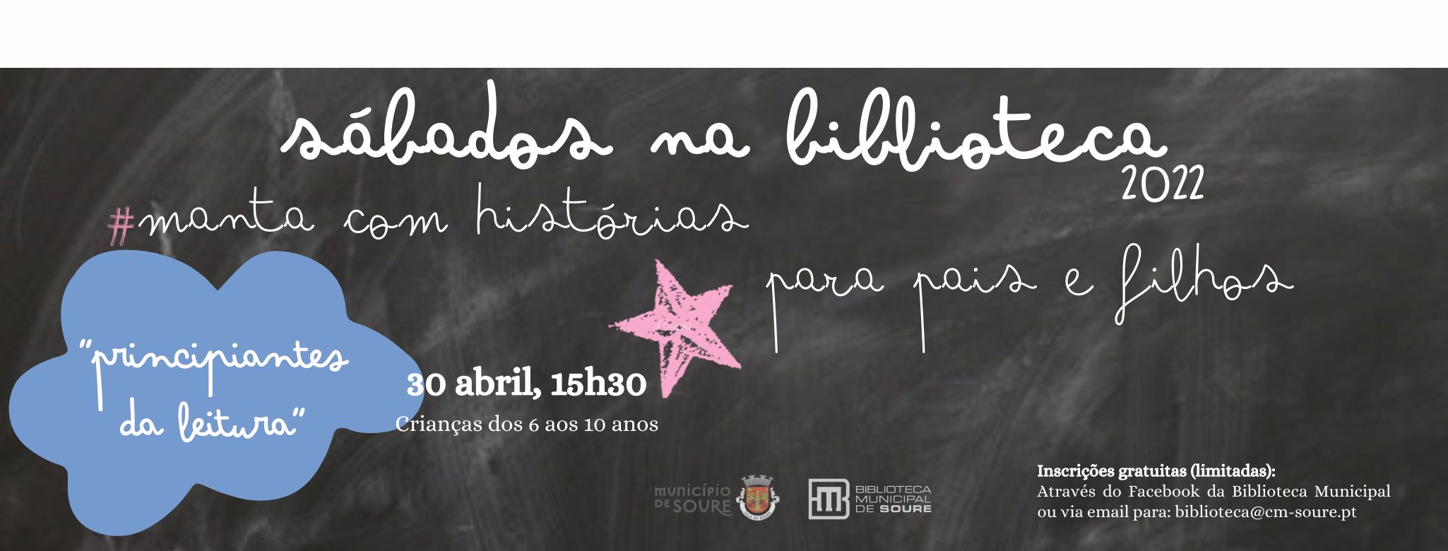 Acesso gratuito, com inscrições (limitadas) através do Facebook da Biblioteca Municipal em: https://www.facebook.com/bibliotecamunicipalsoure ou via email para: biblioteca@cm-soure.pt