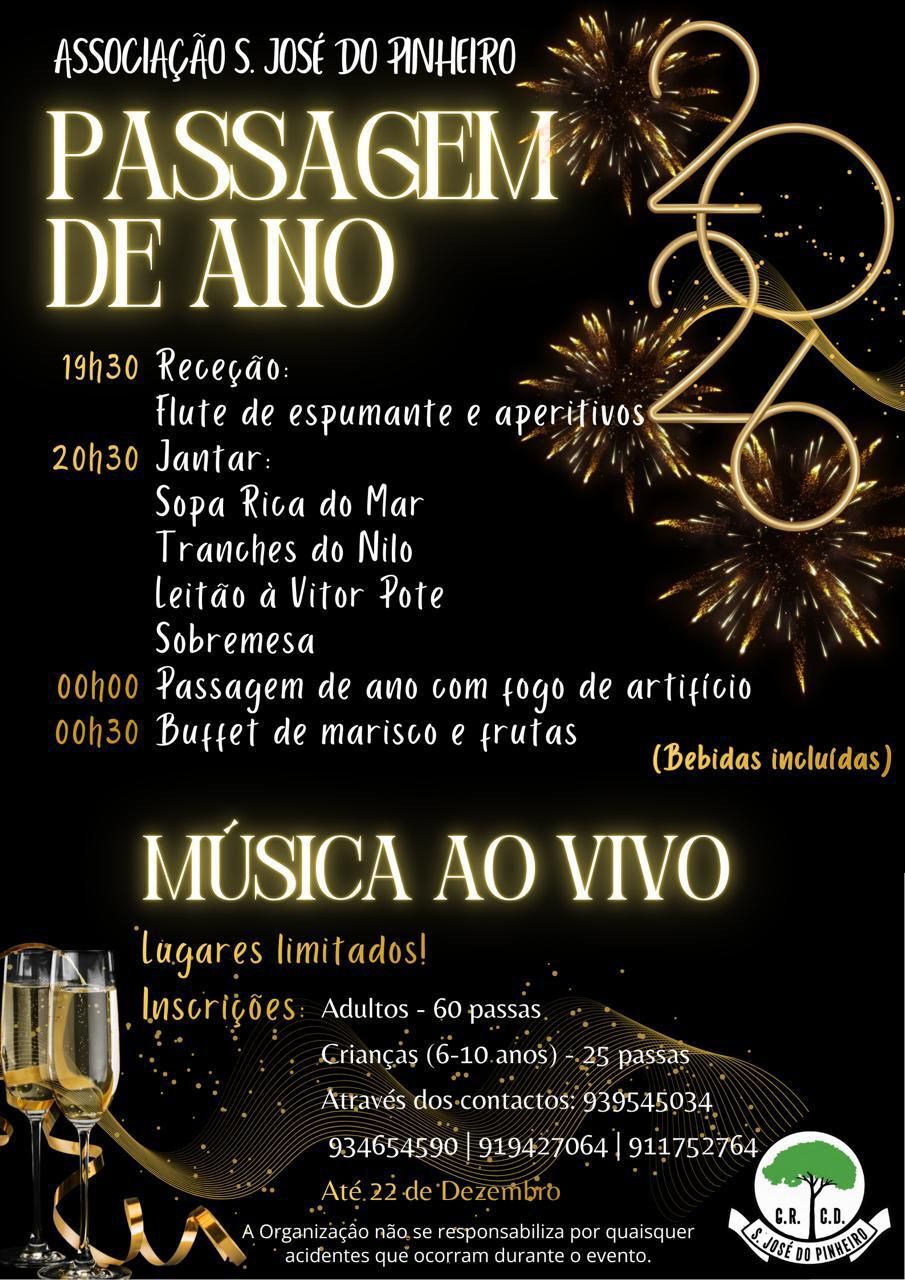 A Associação de São José do Pinheiro organiza a sua Passagem de Ano, com início às 19h30, num convívio marcado pela boa mesa, música ao vivo e espírito comunitário.