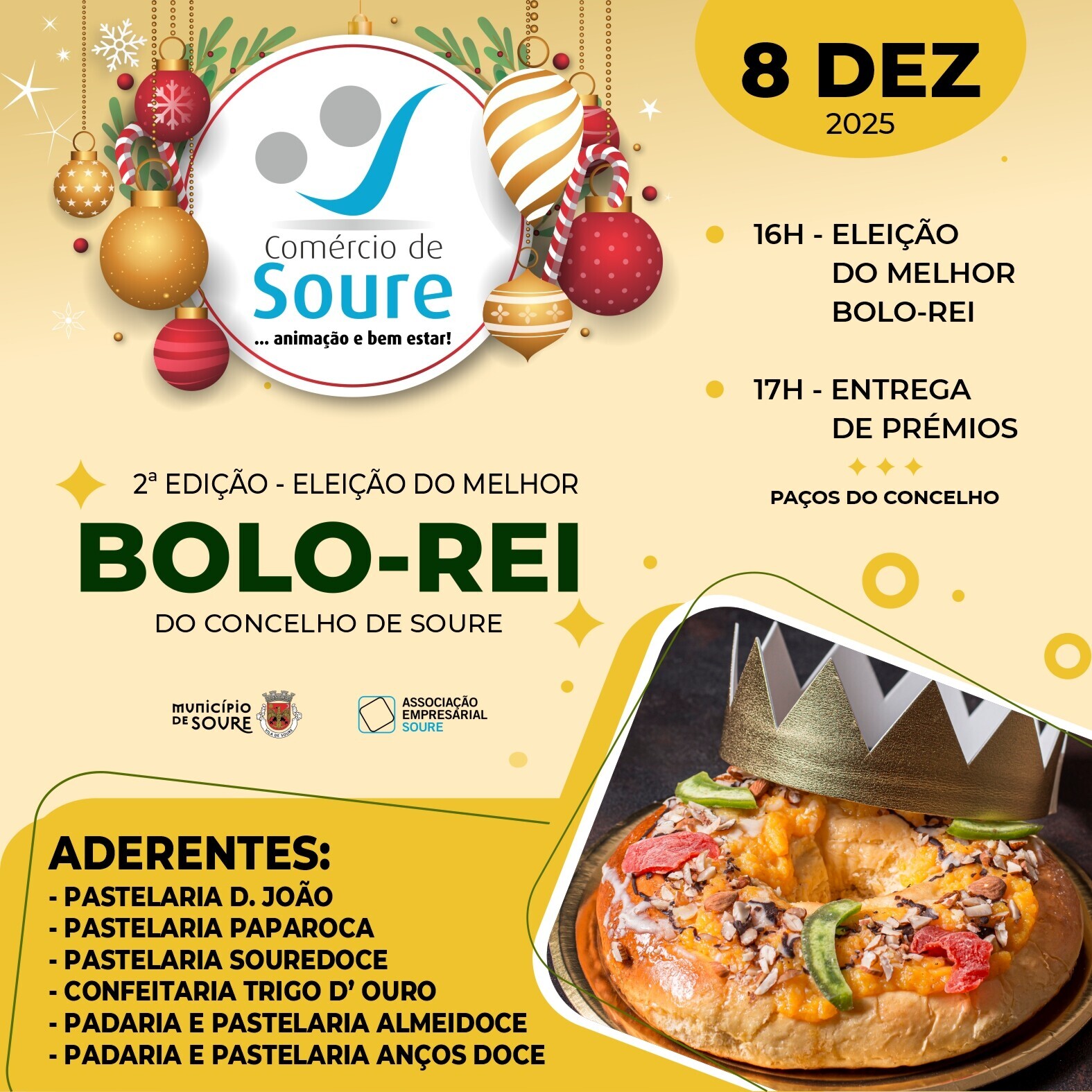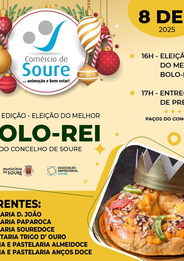 No próximo dia 8 de dezembro, o Município de Soure e a Associação Empresarial de Soure promovem a 2.ª edição da Eleição do Melhor Bolo-Rei do Concelho. A iniciativa decorre nos Paços do Concelho, contando com a participação de várias pastelarias locais.