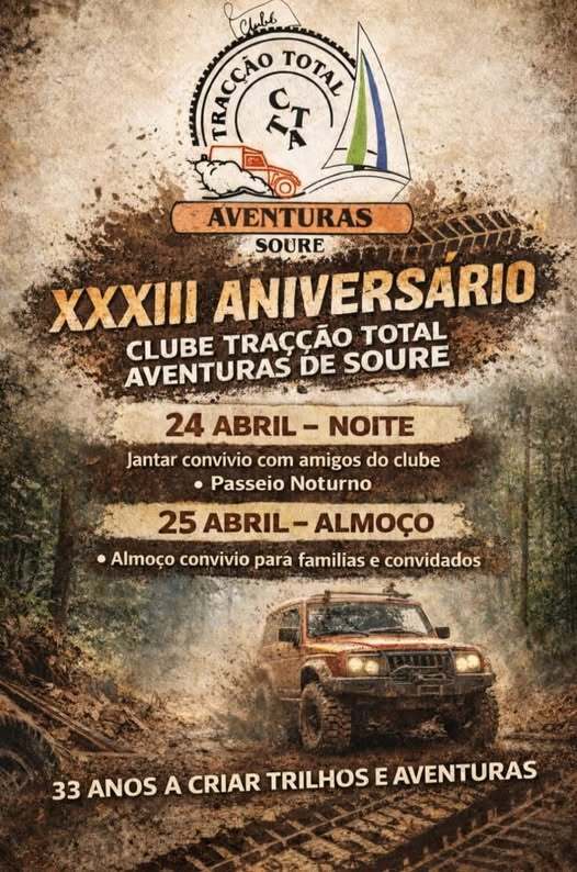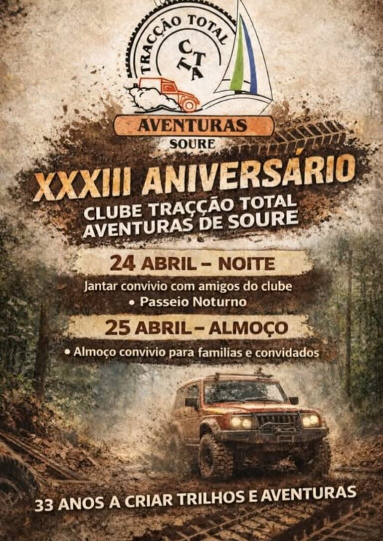 O Clube Tracção Total Aventuras de Soure assinala o seu XXXIII aniversário nos dias 24 e 25 de abril de 2026, com um programa dedicado ao convívio e ao espírito de aventura que caracteriza a associação.