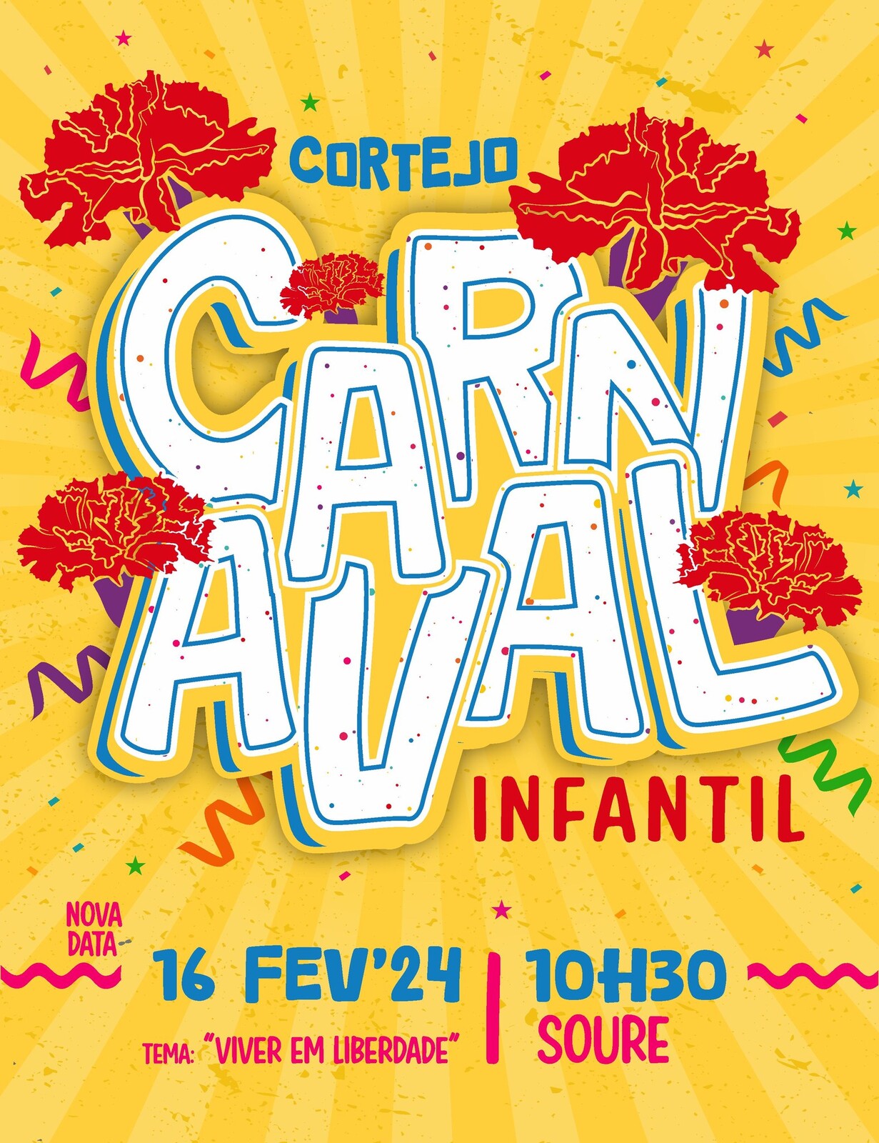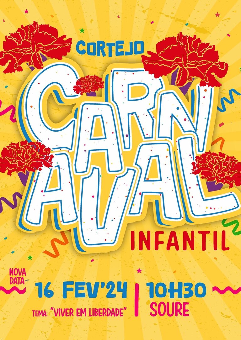 No dia 09 de fevereiro, sexta-feira, o Município de Soure promove o já tradicional Cortejo de Carnaval Infantil, sob a temática “Viver em Liberdade”, onde estão já confirmados mais de 1000 participantes, provenientes dos estabelecimentos de ensino e IPSS do Concelho.