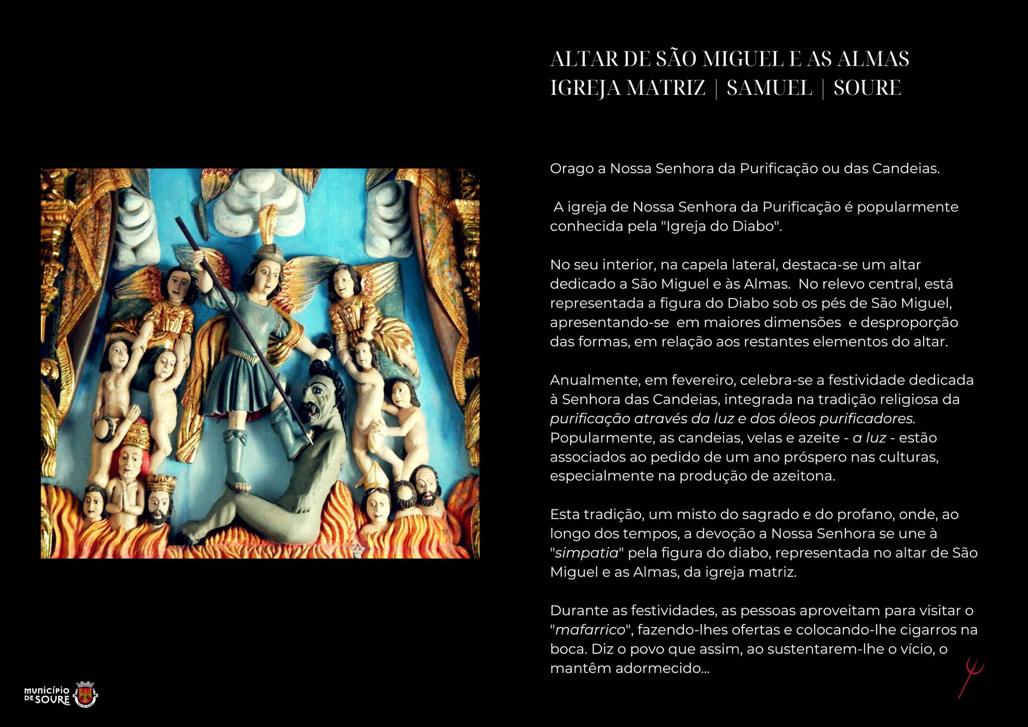 Esta tradição, um misto do sagrado e do profano, onde, ao longo dos tempos, a devoção a Nossa Senhora se une à “simpatia” pela figura do diabo, representada no altar de São Miguel e as Almas, da igreja matriz.