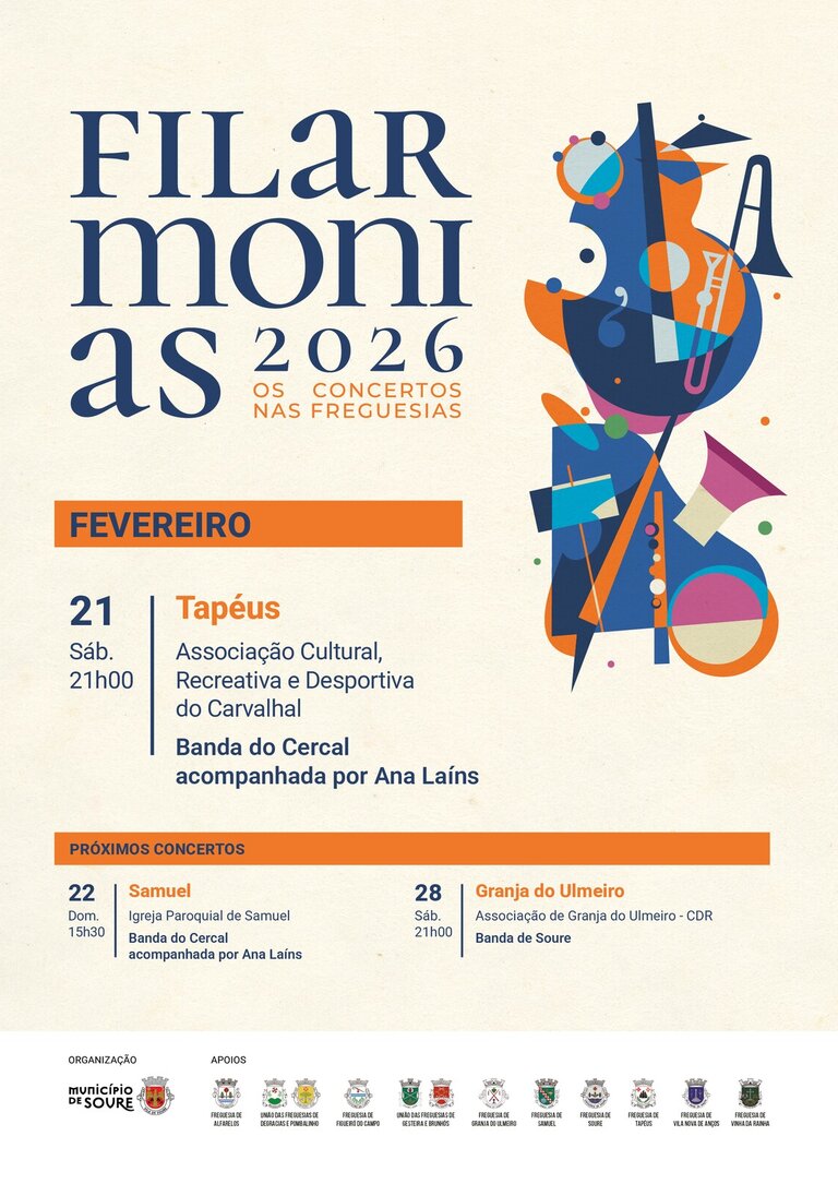 Na continuidade da aposta na descentralização cultural e na valorização das bandas filarmónicas, o Município de Soure promove o programa Filarmónias 2026 – Concertos nas Freguesias, com o objetivo de levar a música a todo o território do concelho e reforçar a identidade cultural local.