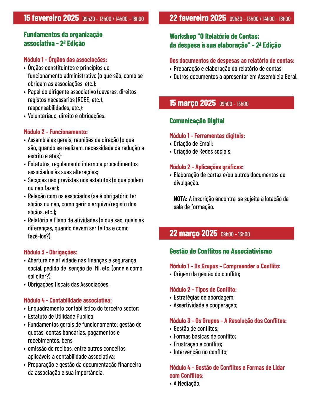 As várias ações irão decorrer nos dias 15, 22 de fevereiro, 15 e 22 de março de 2025, decorrerão ao sábado, e destinam-se a dirigentes das Associações sediadas no Concelho de Soure.