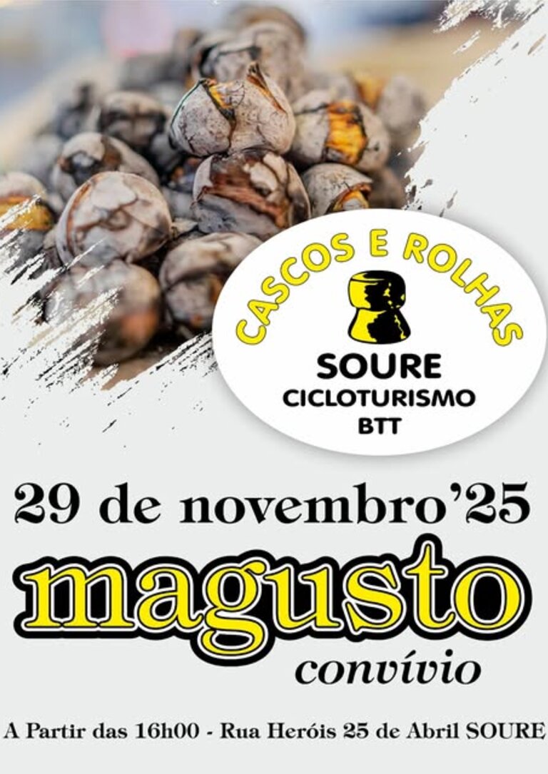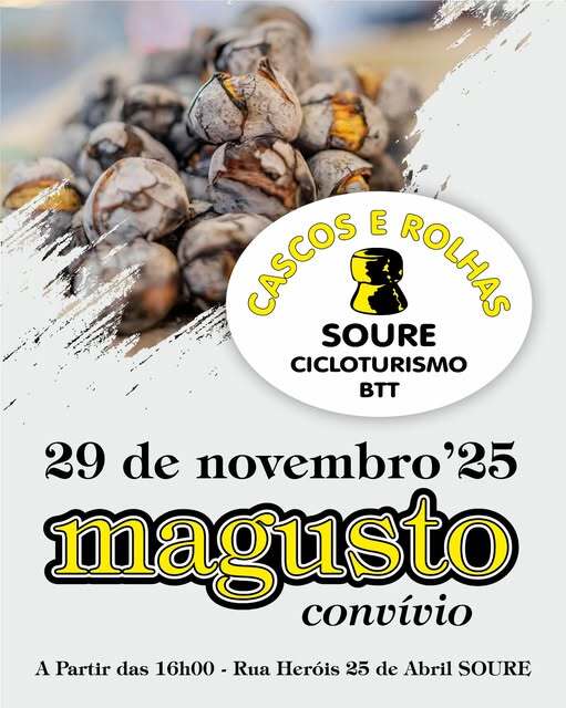 O grupo Cascos e Rolhas – Soure Cicloturismo BTT promove no dia 29 de novembro, a partir das 16h00, um magusto convívio na Rua Heróis 25 de Abril, em Soure.