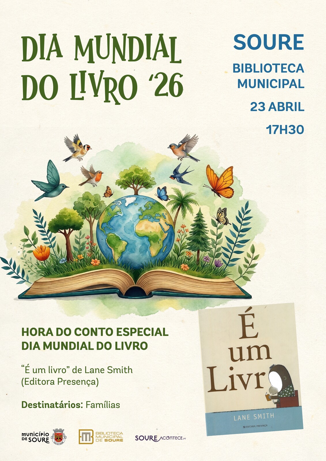 A Biblioteca Municipal de Soure assinala o Dia Mundial do Livro, no próximo dia 23 de abril de 2026, pelas 17h30, com a realização de uma hora do conto especial, dirigida a famílias.