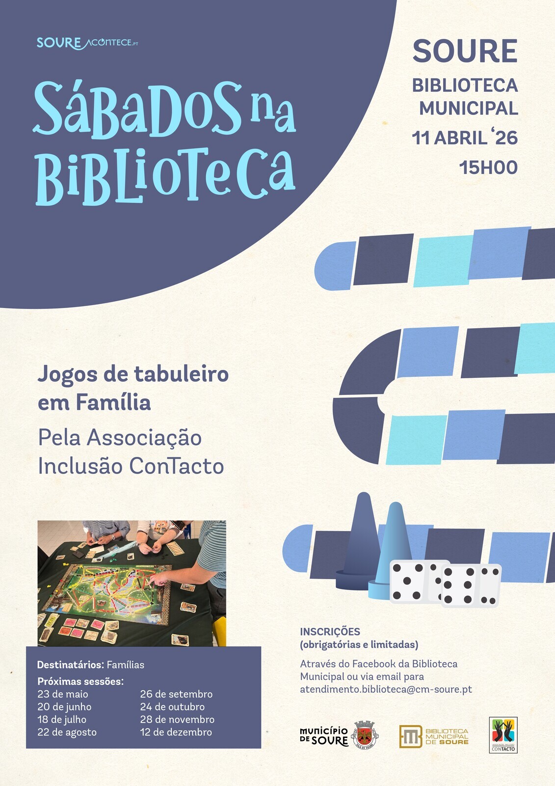 A Biblioteca Municipal de Soure promove, no próximo dia 11 de abril de 2026, pelas 15h00, mais uma sessão da iniciativa “Sábados na Biblioteca”, desta vez dedicada aos jogos de tabuleiro em família.