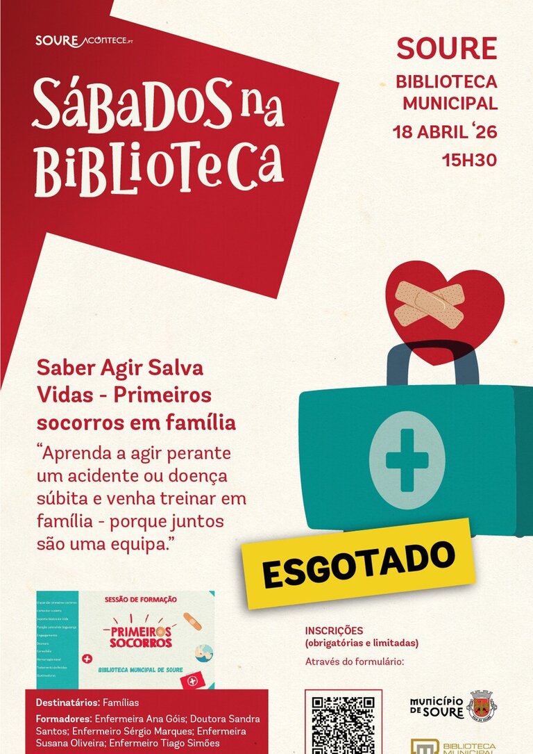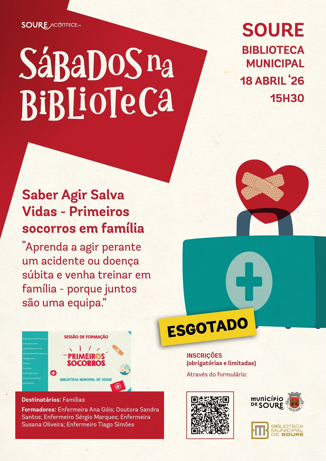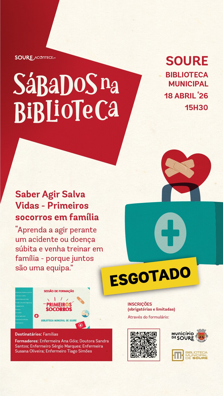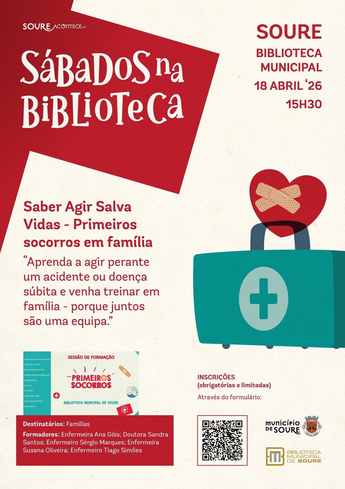 A Biblioteca Municipal de Soure promove, no próximo dia 18 de abril de 2026, pelas 15h30, mais uma sessão da iniciativa “Sábados na Biblioteca”, desta vez subordinada ao tema “Saber Agir Salva Vidas – Primeiros socorros em família”.