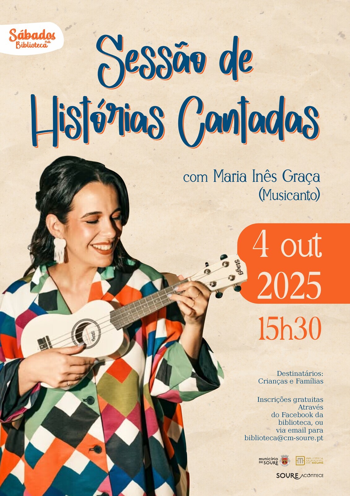 No próximo dia 4 de outubro de 2025, às 15h30, a Biblioteca Municipal de Soure convida crianças e famílias para uma tarde especial com Maria Inês Graça (Musicanto).