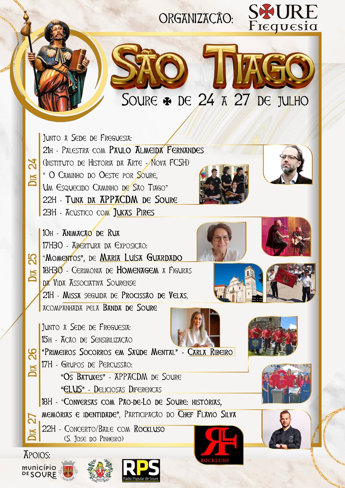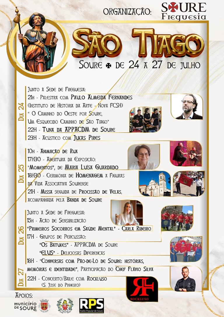 De 24 a 27 de julho, a Junta de Freguesia de Soure celebra São Tiago, Padroeiro da Vila. Serão 4 dias preenchidos com iniciativas diversas, da cultura à religião, passando pela gastronomia, história, música e saúde mental.
