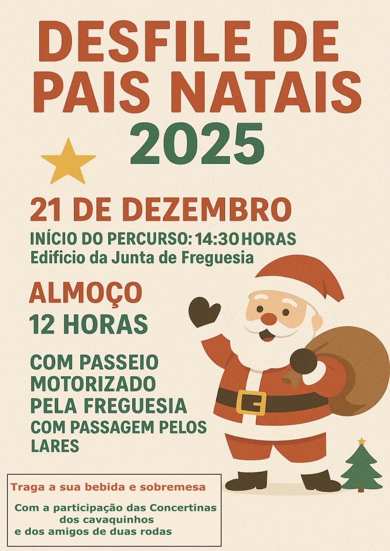 No próximo domingo, dia 21 de dezembro, realiza-se o tradicional Desfile de Pais Natais, com passagem pelas localidades da freguesia e visita aos lares de idosos.