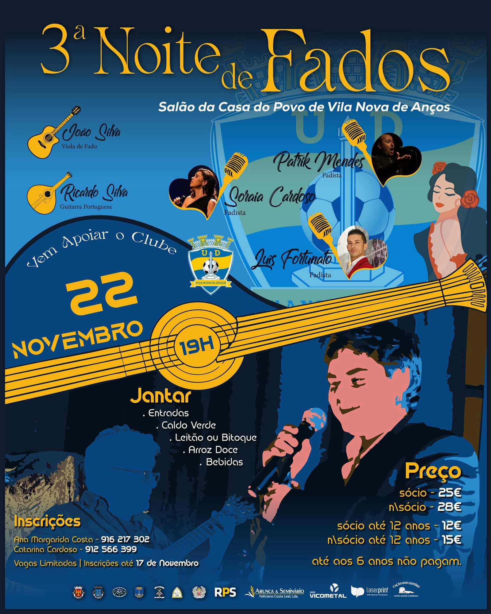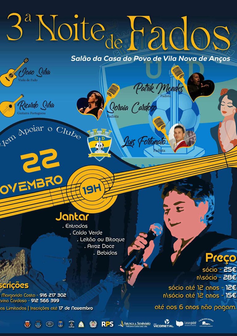 A União Desportiva de Vila Nova de Anços promove a sua 3.ª Noite de Fados, no dia 22 de novembro, pelas 19h00, no Salão da Casa do Povo de Vila Nova de Anços.