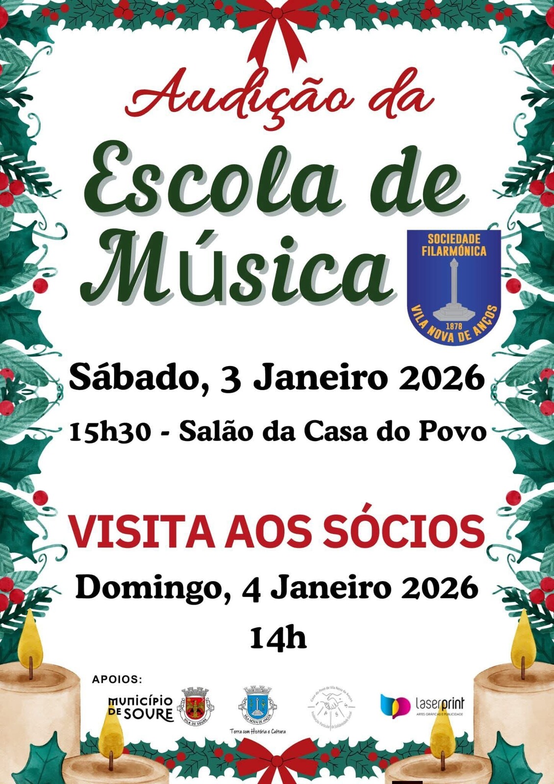 A Sociedade Filarmónica de Vila Nova de Anços promove a Audição da sua Escola de Música, no sábado, dia 3 de janeiro de 2026, às 15h30, no Salão da Casa do Povo.