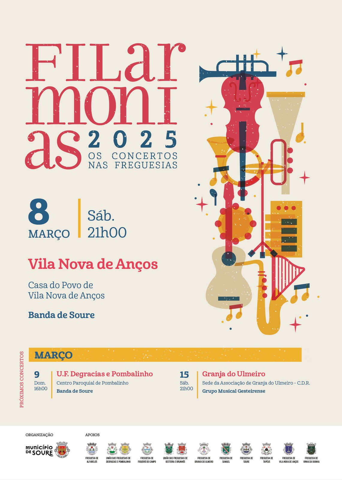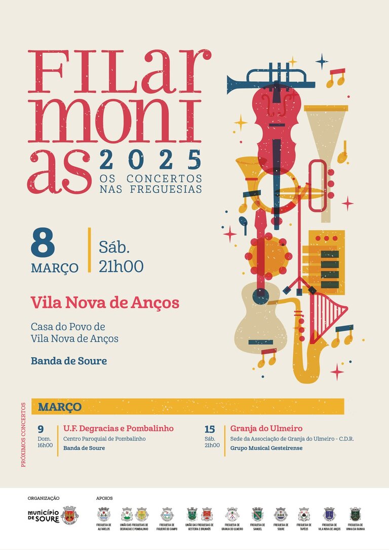 Na tentativa de fazer chegar a música a todo o território do concelho, o Município de Soure promove o Programa "Filarmonias 2025, Os Concertos nas Freguesias" em parceria com as Juntas de Freguesia. O objetivo é descentralizar as atividades culturais, fazendo chegar este programa a todas as freguesias e promover a diversidade musical.