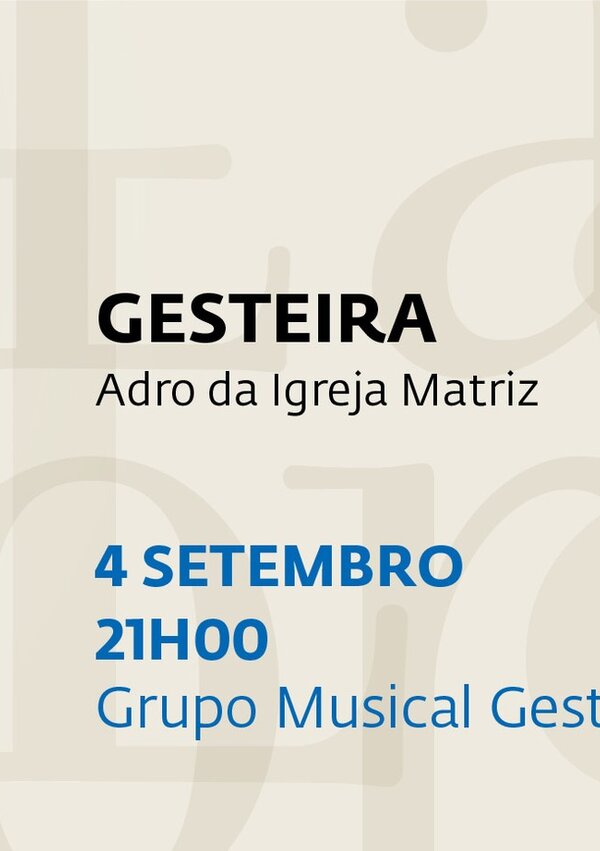 • 04 de setembro | Sábado• GRUPO MUSICAL GESTEIRENSE• Horário| 21h00m• Local | Gesteira - Adro da Igreja Matriz• União das Freguesias de Gesteira ...