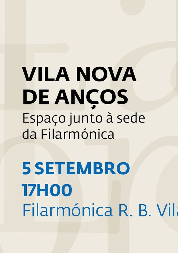 • 05 de setembro | Domingo• FILARMÓNICA R. B. VILANOVENSE• Horário| 17h00m• Local | Vila Nova de Anços - Espaço junto à sede da Filarmónica• ... -