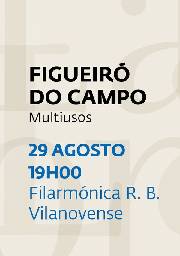 • 29 de agosto | Domingo• SOCIEDADE FILARMÓNICA RECREATIVA E BENEFICENTE VILANOVENSE• Horário| 19h00m• Local | Figueiró do Campo - Multiusos• ... -