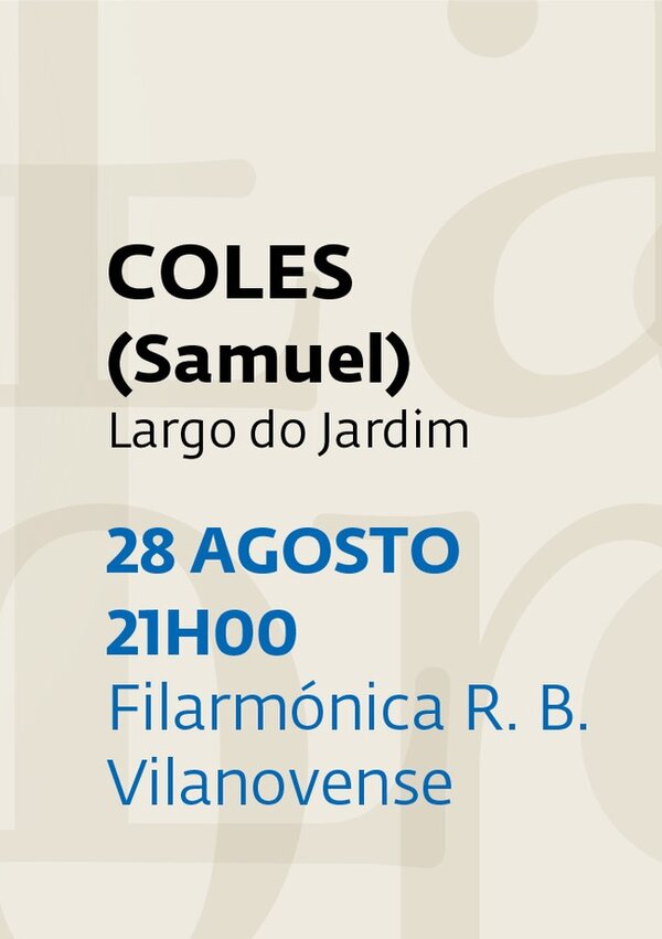• 28 de agosto | Sábado• SOCIEDADE FILARMÓNICA RECREATIVA E BENEFICENTE VILANOVENSE• Horário| 21h00m• Local | Coles - Largo do Jardim• Freguesia ... -