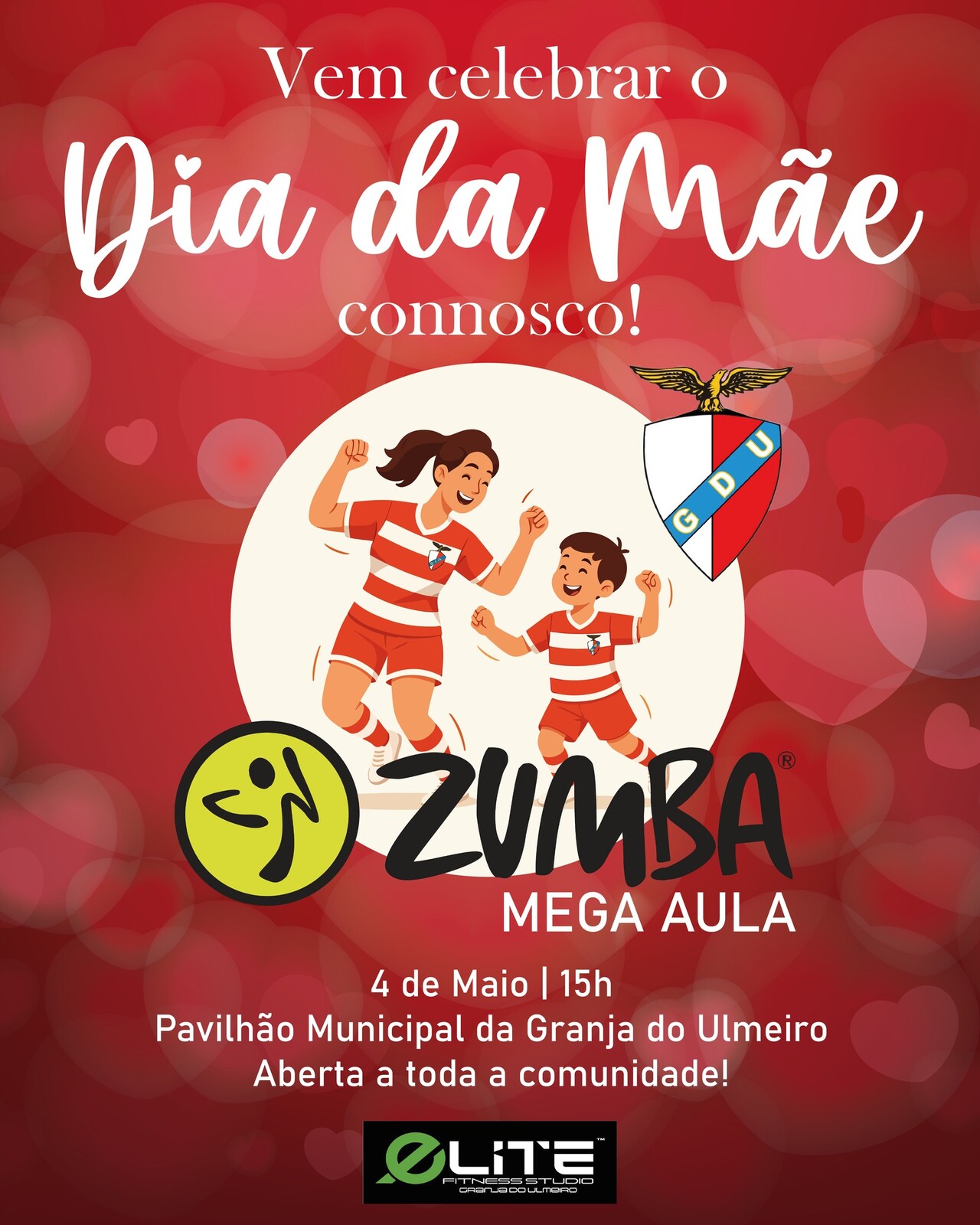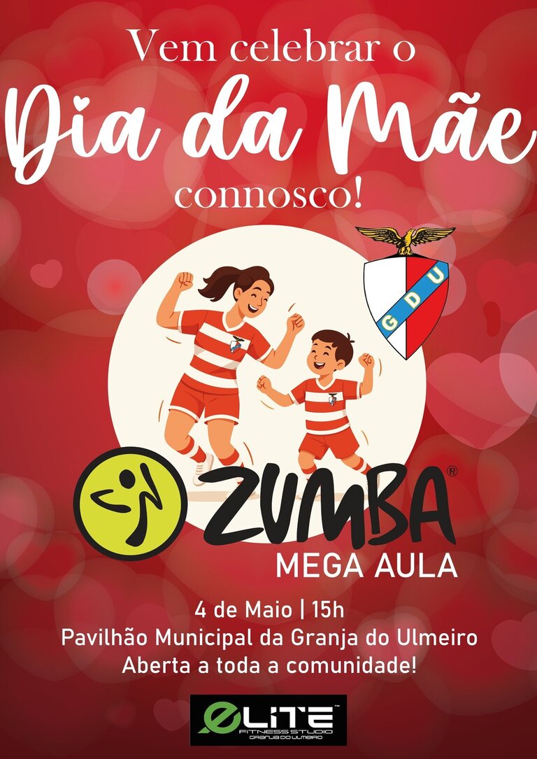 O GDU e o Elite Fitness Studio prepararam uma Mega Aula de Zumba para mães e filhos no dia 4 de maio, às 15h, no Pavilhão Municipal da Granja do Ulmeiro!