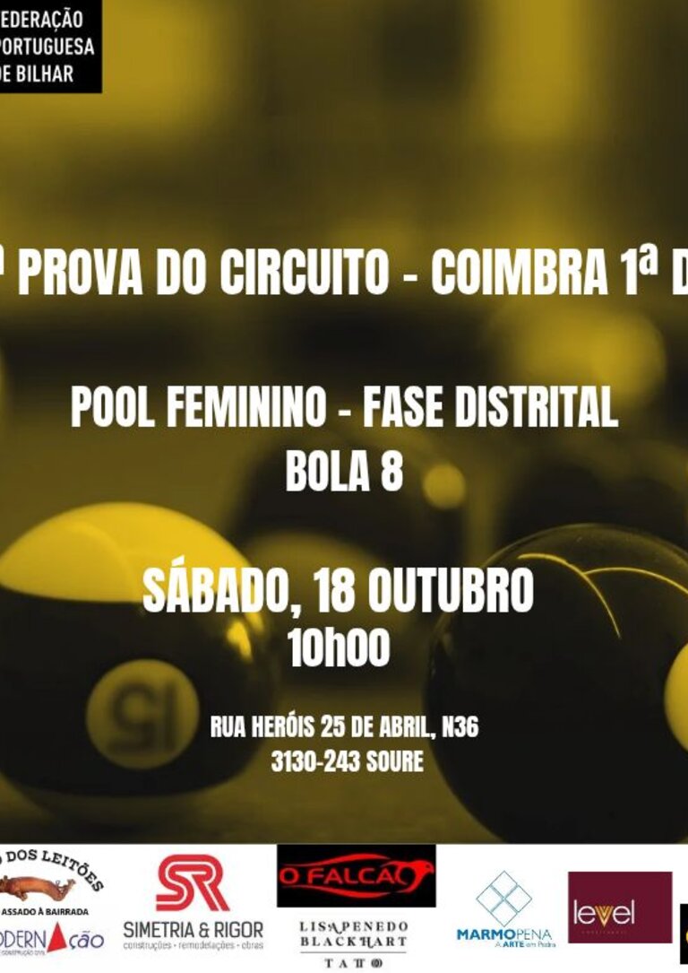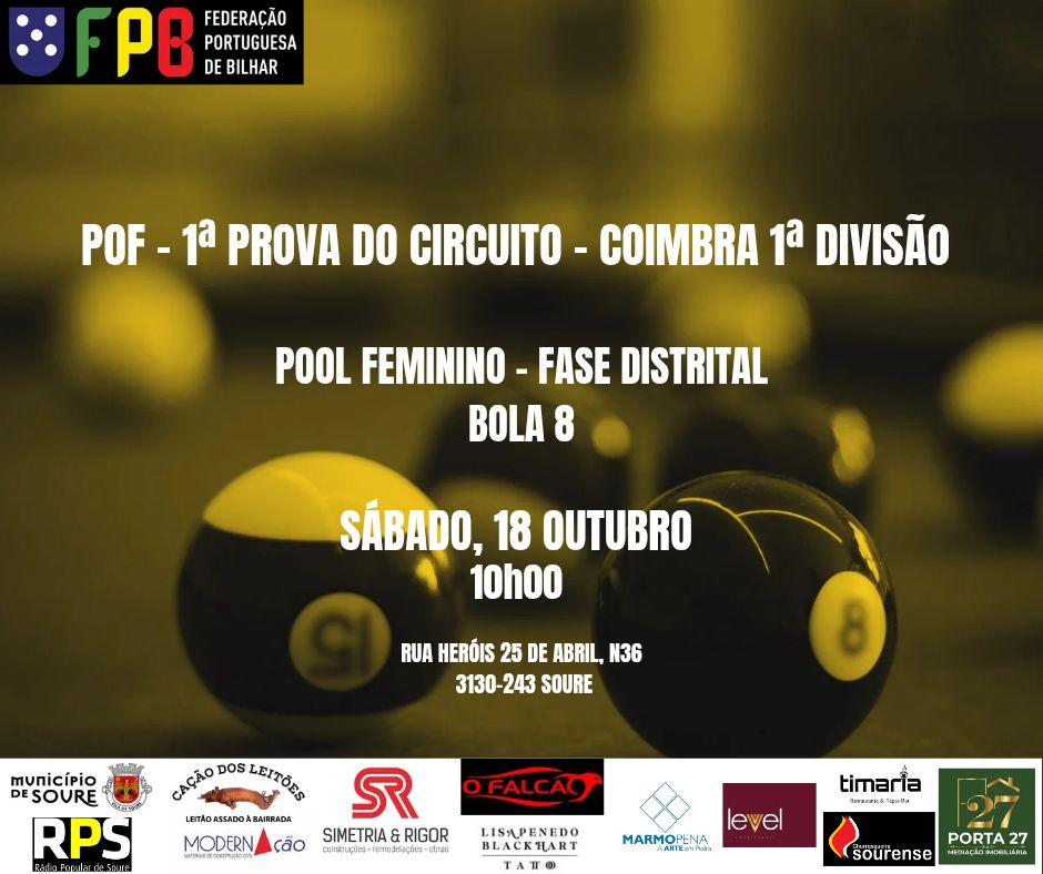 No próximo sábado, 18 de outubro, às 10h00, realiza-se em Soure a fase distrital do Pool Feminino – Bola 8, integrada na 1.ª prova do circuito de Coimbra.