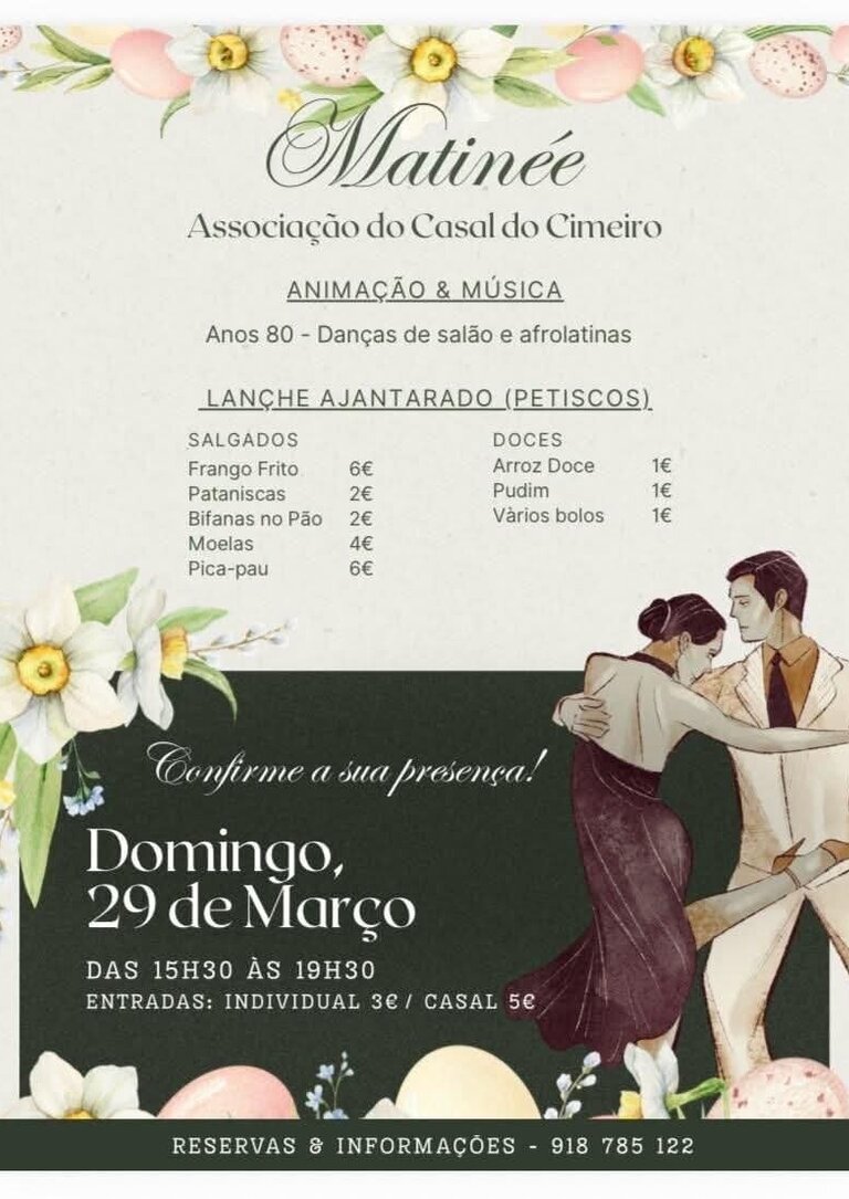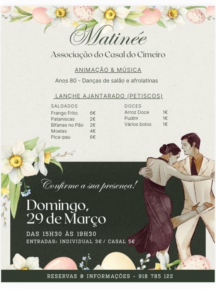 A Associação do Casal do Cimeiro promove, no próximo domingo, dia 29 de março, uma animada Matinée, com música dos anos 80, danças de salão e ritmos afrolatinos.