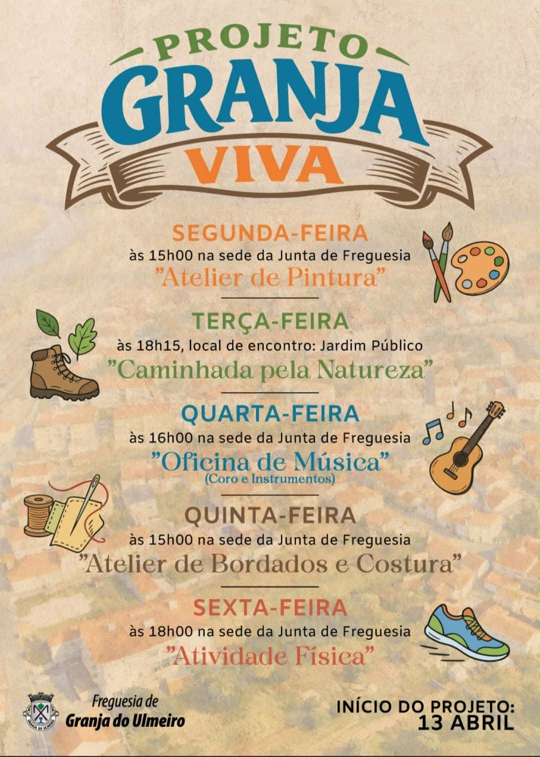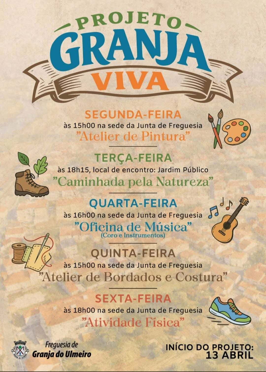 A freguesia da Granja do Ulmeiro dá início, no próximo dia 13 de abril, ao projeto “Granja Viva”, uma iniciativa que promove o bem-estar, a participação comunitária e a valorização de atividades tradicionais e culturais.