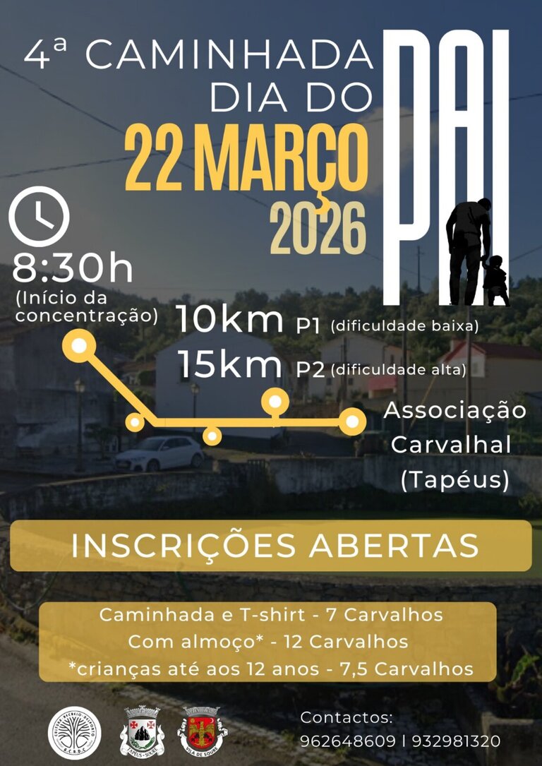 No próximo dia 22 de março, srealiza-se a 4.ª Caminhada do Dia do Pai, dinamizada pela secção de Desporto da A.C.R.D.C. - Associação do Carvalhal (Tapéus).