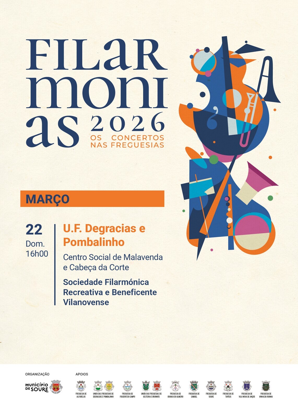 Na continuidade da aposta na descentralização cultural e na valorização das bandas filarmónicas, o Município de Soure promove o programa Filarmónias 2026 – Concertos nas Freguesias, com o objetivo de levar a música a todo o território do concelho e reforçar a identidade cultural local.