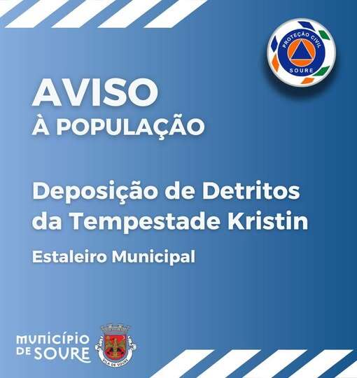 Na sequência dos danos provocados pela tempestade Kristin, informa-se a população que os detritos resultantes de infraestruturas e equipamentos afetados (nomeadamente entulhos, materiais de construção e outros resíduos similares) poderão ser depositados no Estaleiro Municipal, localizado junto ao Cemitério de Soure.