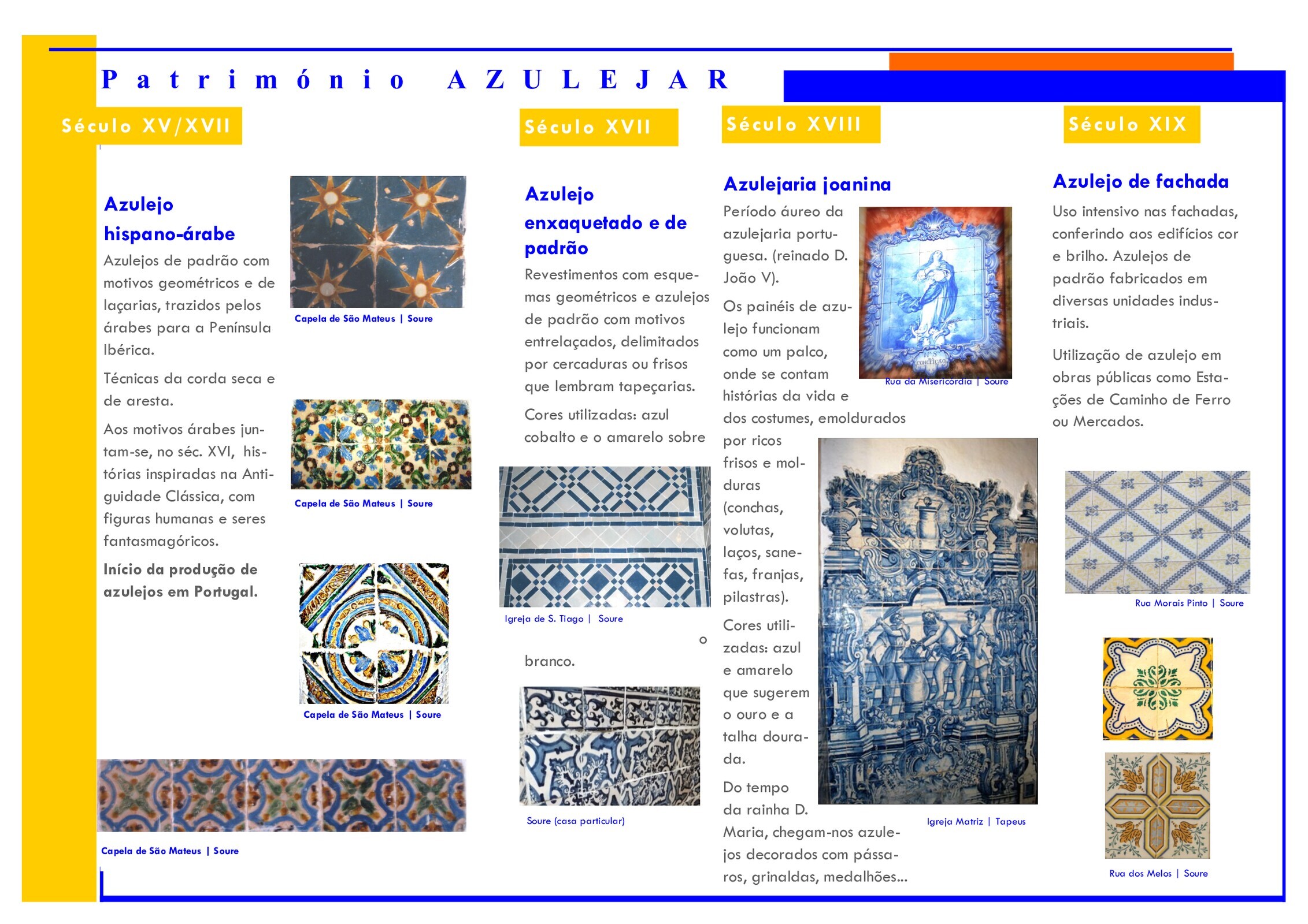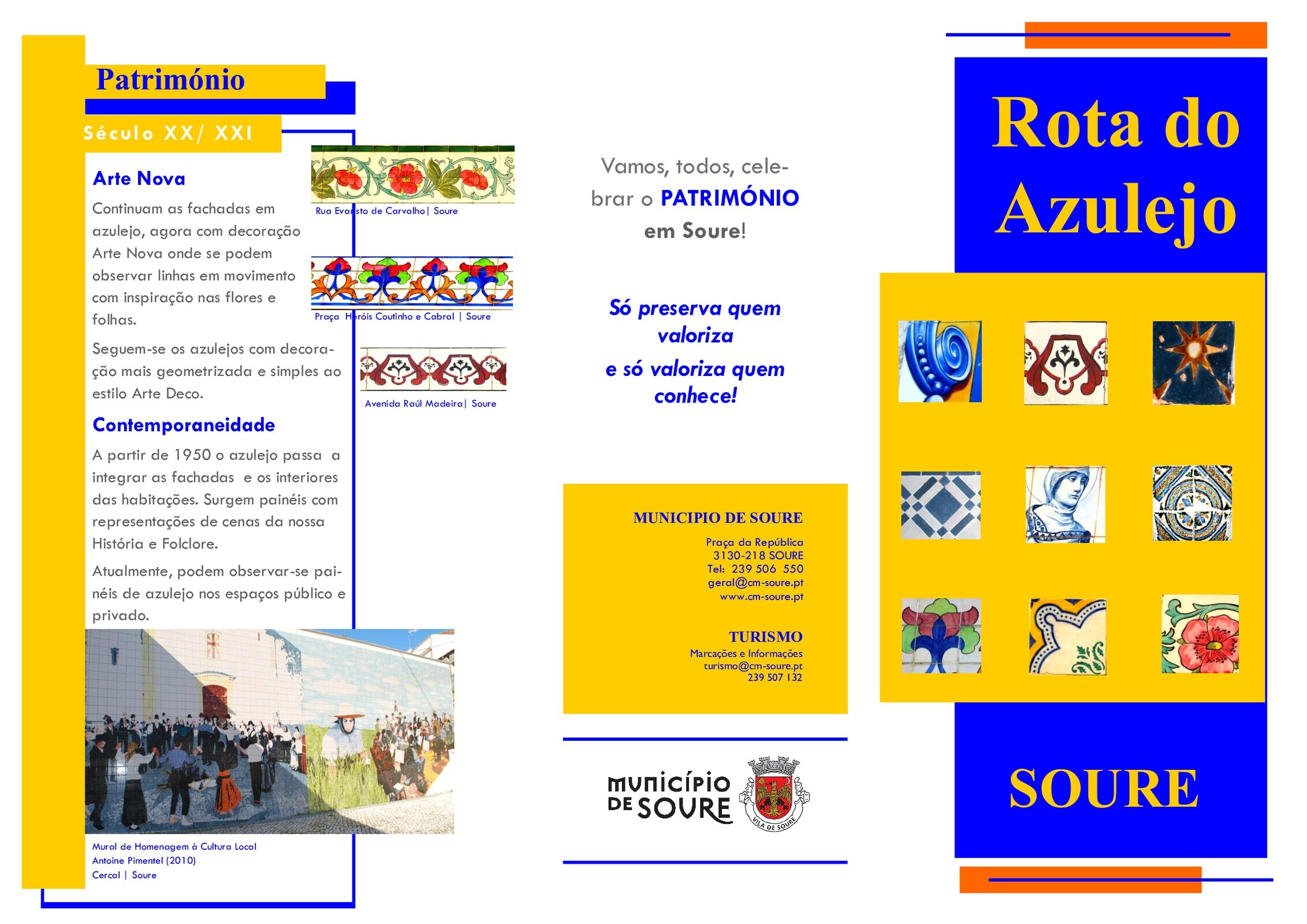 Esta iniciativa tem como objetivo dar a conhecer o património azulejar do concelho de Soure, sensibilizando para a valorização, preservação, fruição e Partilha das Memórias inerentes ao uso do azulejo no concelho de Soure. Durante o percurso, com passagem pela Capela de São Mateus, Igreja Matriz de Tapeus, Cercal e Vila de Soure, podem observar-se exemplares de azulejos hispano-mouriscos do séc. XV/ XVI, passando pelo azulejo enxaquetado e de padrão do séc. XVII, azulejos joaninos do séc. XVIII, azulejos de fachada e Arte Nova do séc. XIX e XX e um painel do séc. XXI.